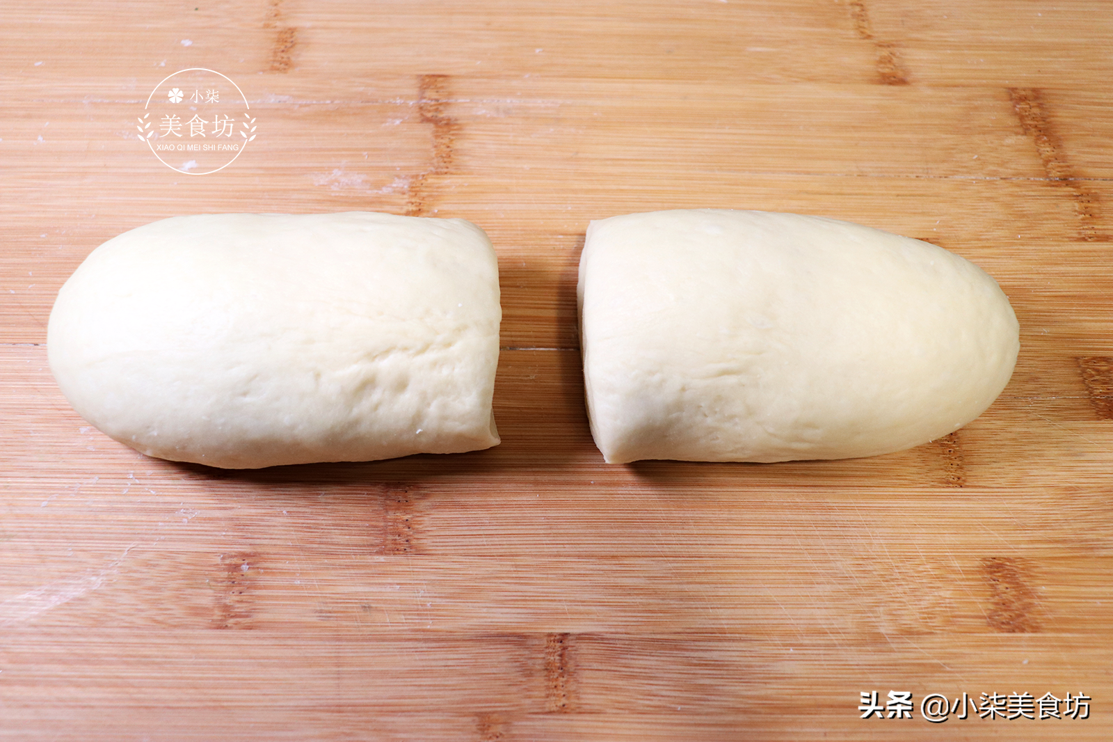 第六步:把发酵好的面团取出放案板上,揉面排出面里面的空气,把面团分成两份。