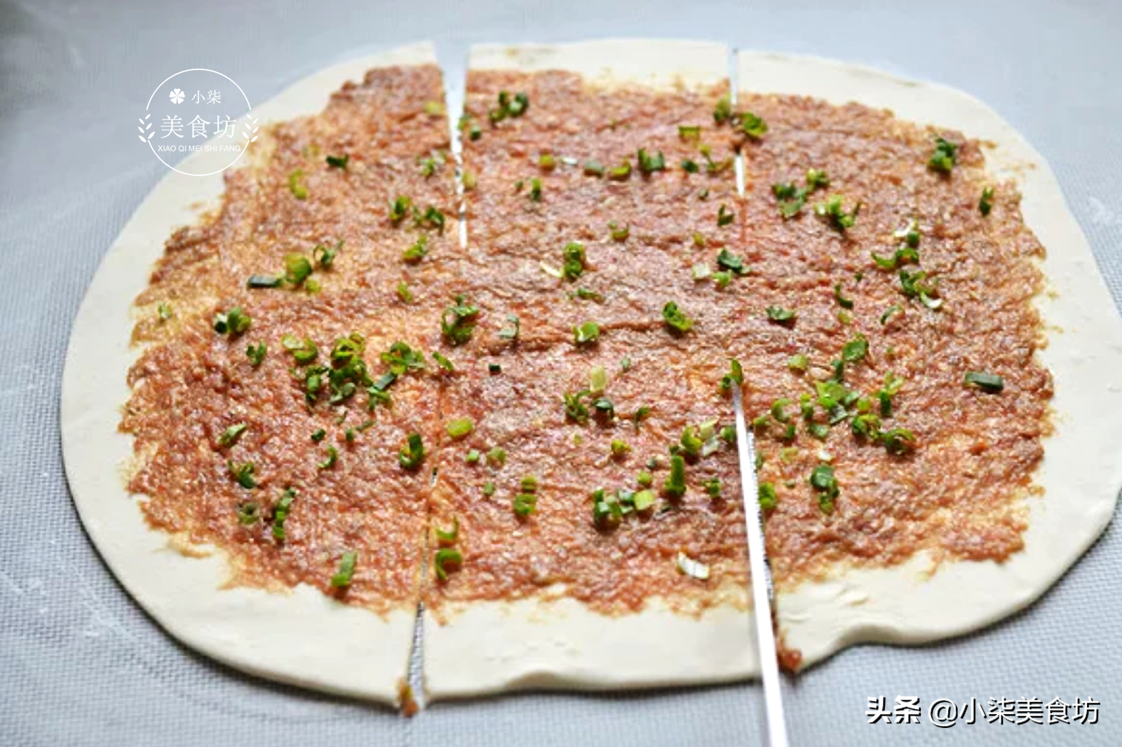 第六步:撒上切好的香葱碎,在面饼两边切四刀,不要切断。