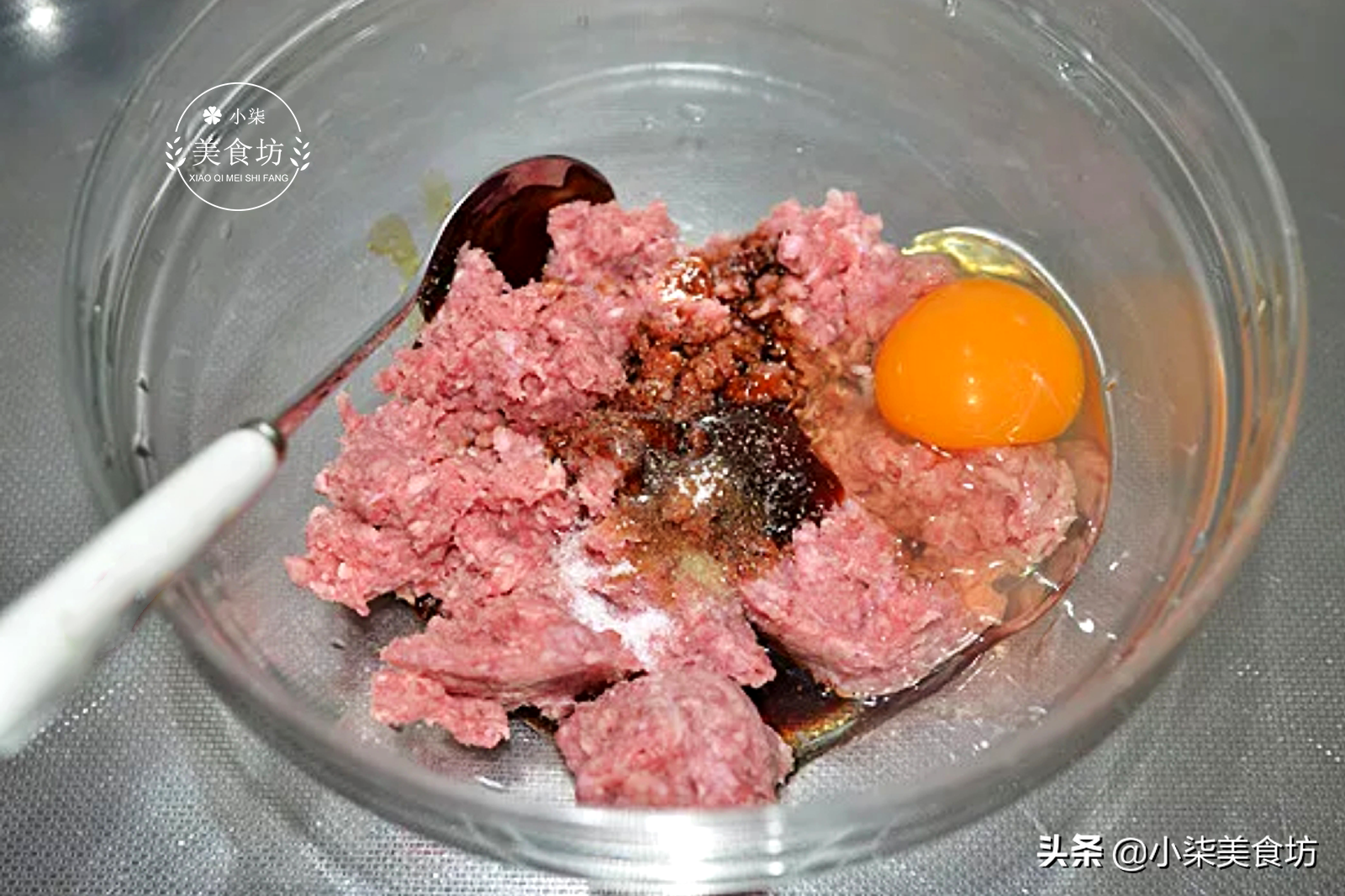 第二步:我们把牛肉切成丁再剁成肉泥放进碗里,打入一个蛋,再加入盐、胡椒粉、生抽、蚝油、盐,加入2勺食用油。