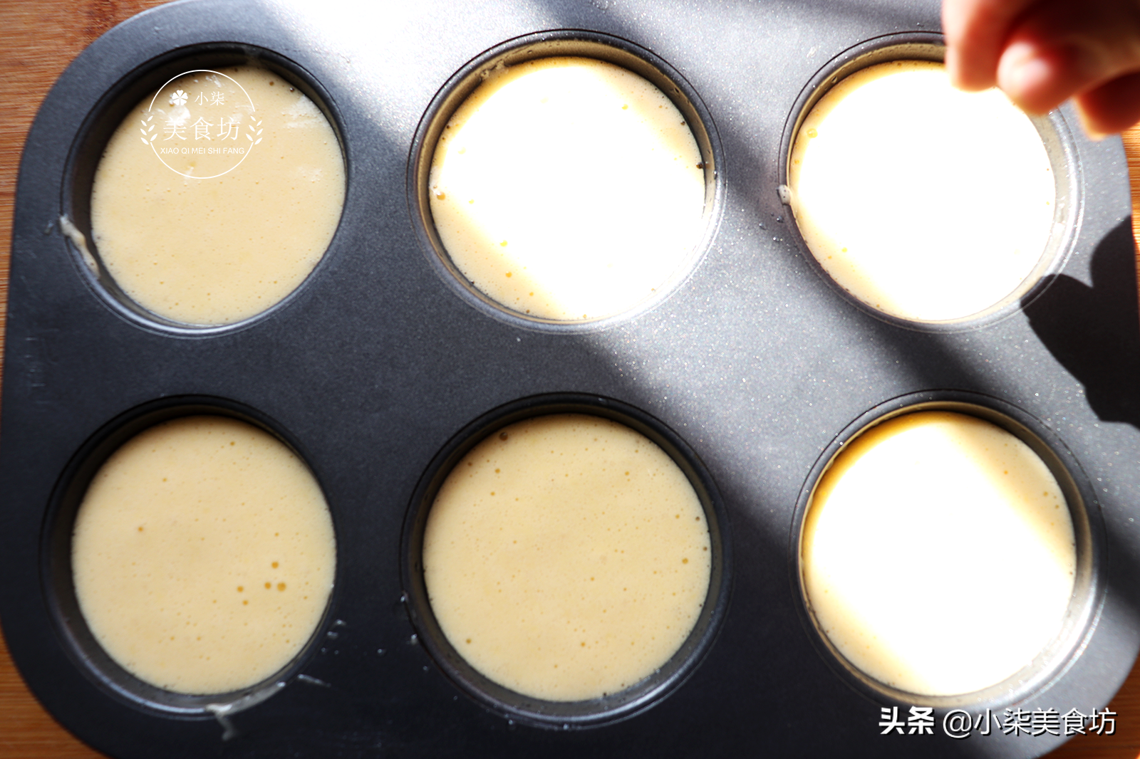 第八步:准备一个汤勺,将面糊一勺一勺小心的倒入模具中。我用这种方法挺好,装九分满即可。