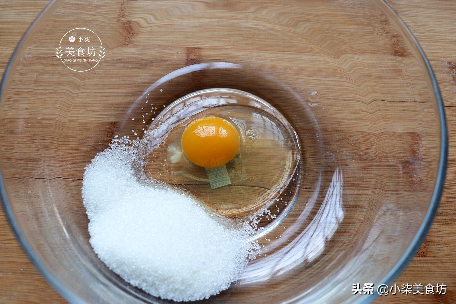 第一步:我们首先在碗中打入一个鸡蛋,净含量在60克左右,如果小鸡蛋可以放两个,加入50克白糖。