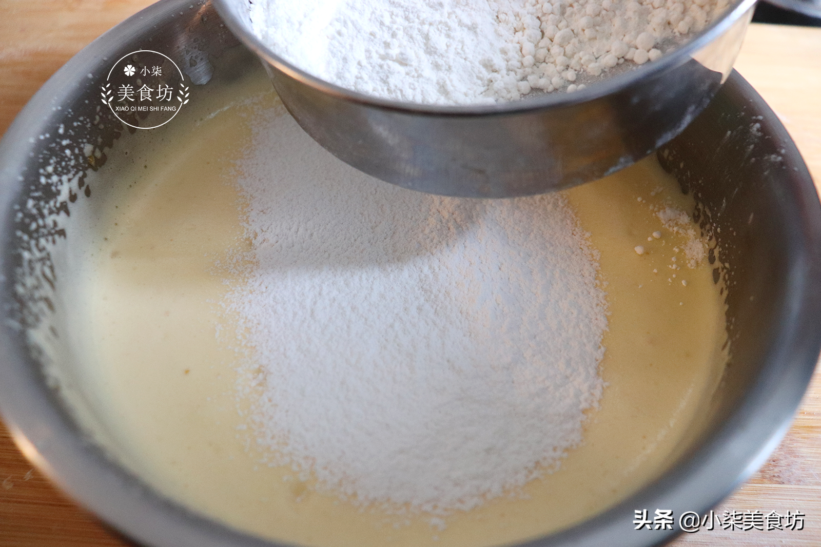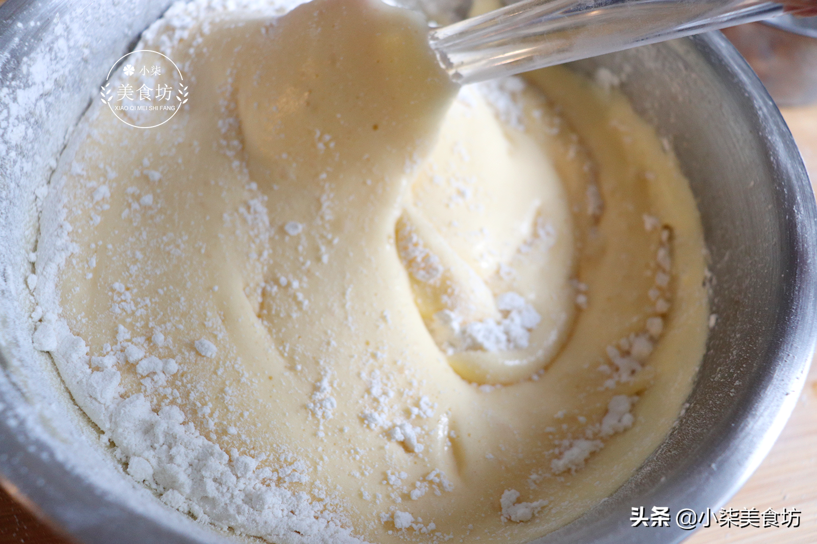 第八步:然后分三次倒入之前的蛋糊里,每一次搅拌均匀继续再倒,同样的搅拌手法,最终得到的面糊顺滑黏稠就可以了。