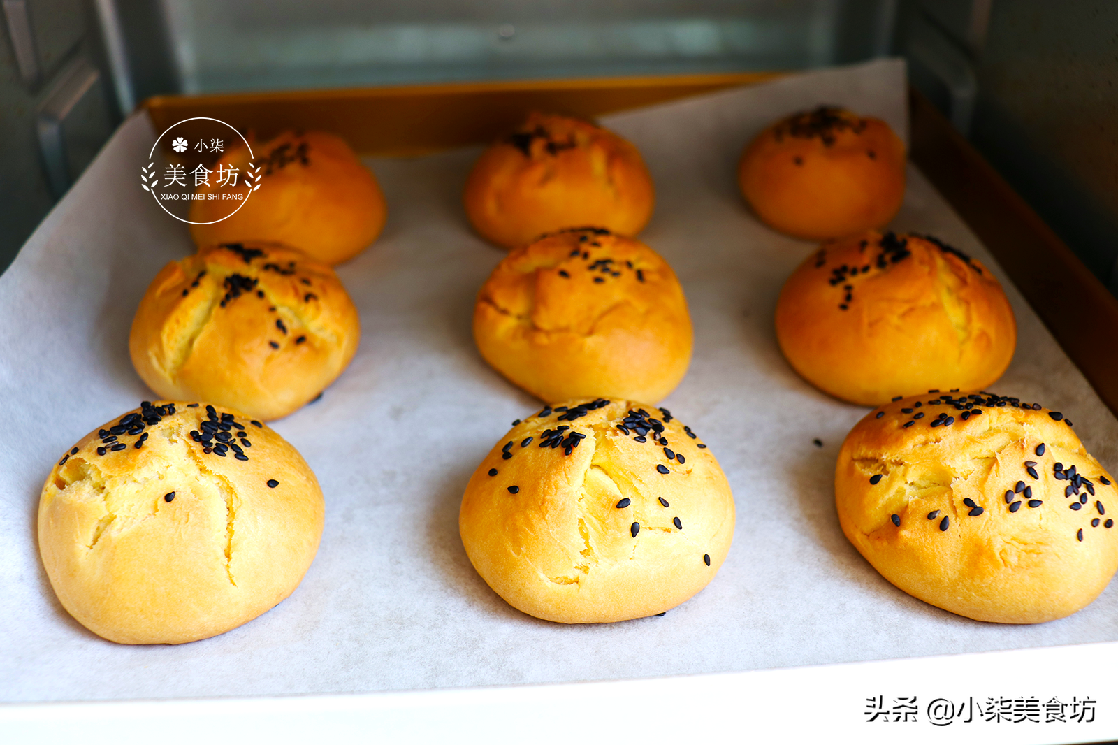 第九步:面剂中间用手指按出一个窝,这样我们烤的时候更容易开花,然后撒上一些黑芝麻,饧发到5分钟之后。烤箱预热,上下火180度烤20分钟即可出炉。