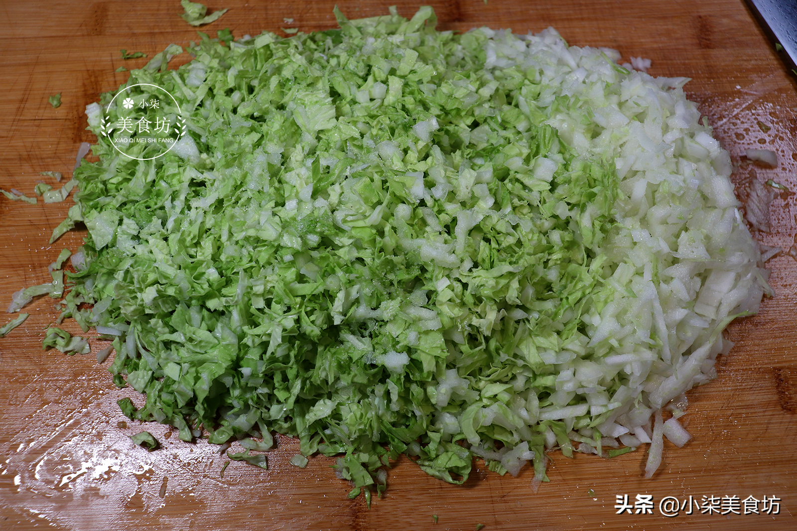 第五步:把白菜叶切成细丝,再切成碎粒,上面撒上一勺盐,搓匀装入盆里,静止10分钟,煞出白菜里的水分。