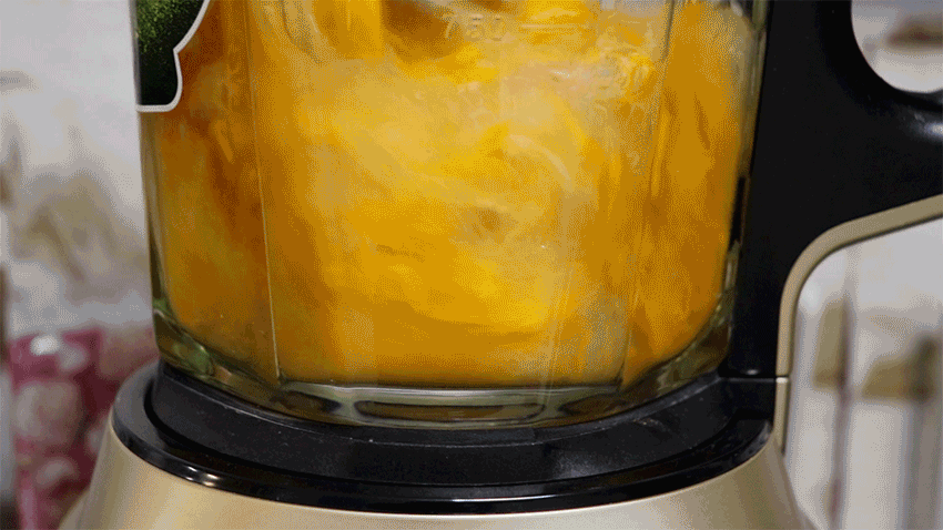 第二步:把切好的南瓜放入破壁机里,倒入250毫升清水,打开蔬果键,打成细腻的南瓜汁。