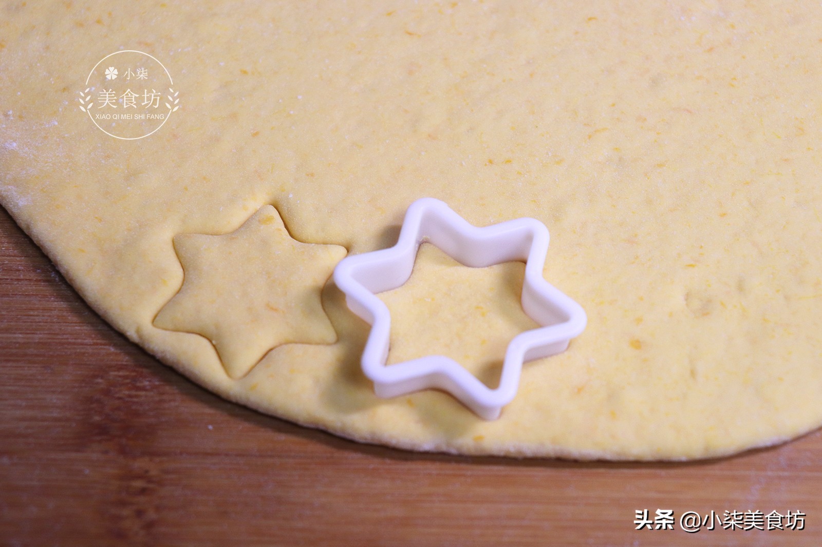 第七步:然后取一个模具压出一个个小的花型,小面包胚子就做出来了。没有模具的也可以切成菱形块。