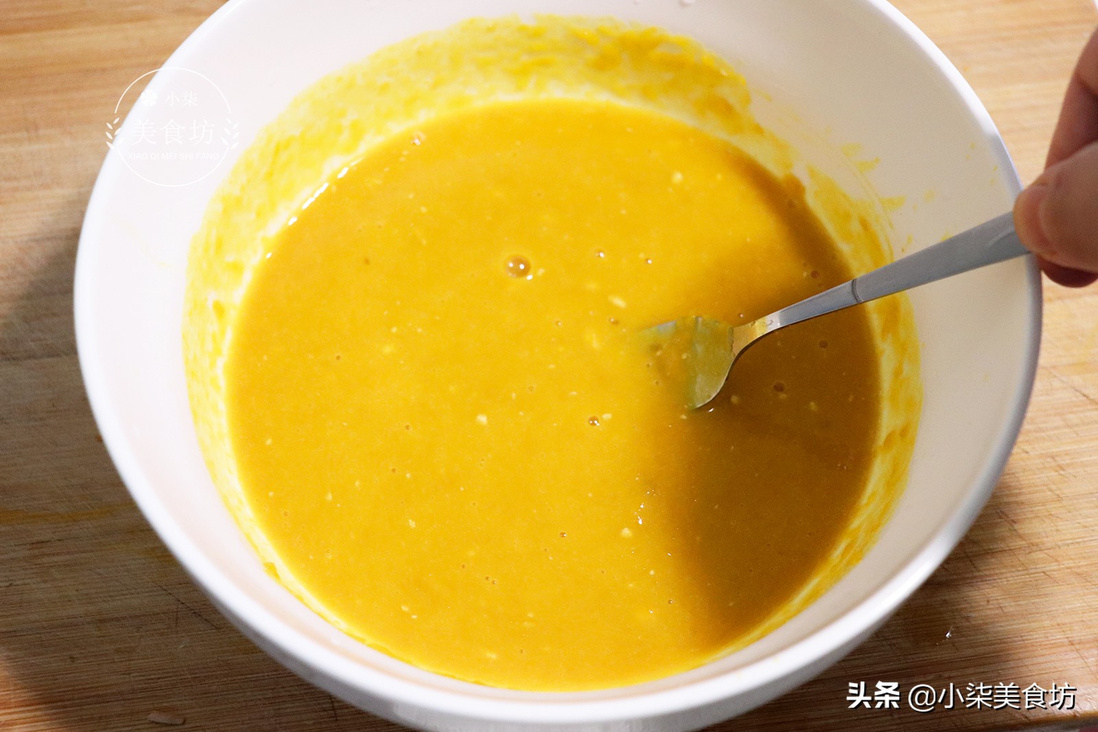 第五步:取一个叉子把鸡蛋和酵母搅拌均匀,多搅拌一会,让酵母完全融化在南瓜泥里。