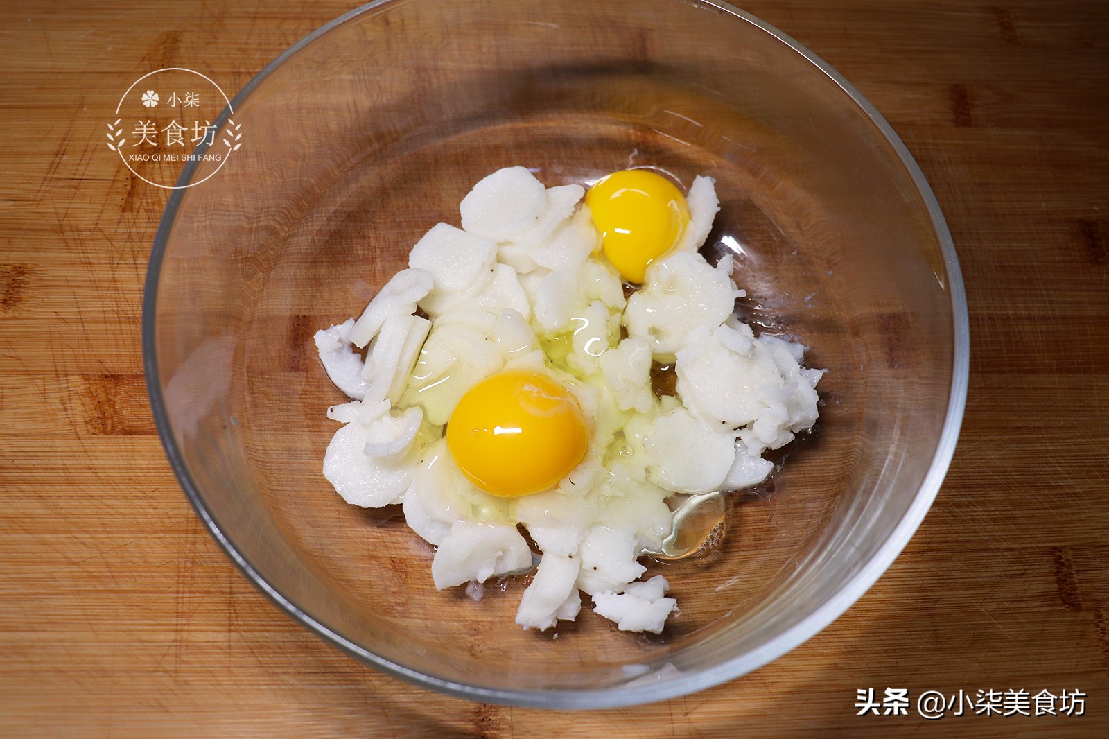 第三步:把蒸熟的山药放在大碗里,稍微晾凉打入2个鸡蛋,取一个擀面杖把山药捣成泥。