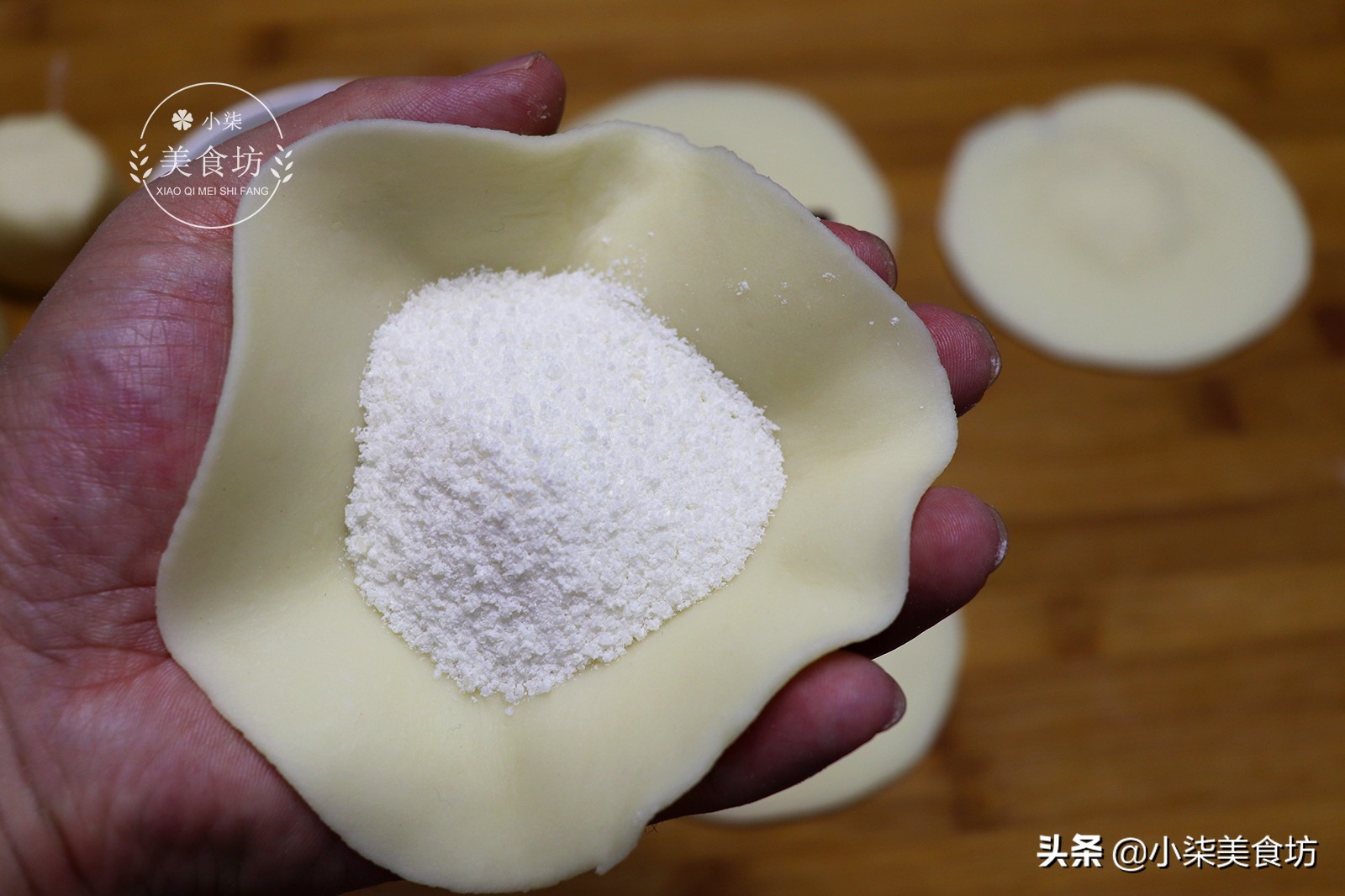 第六步:取一个擀好的面皮,放上适量糖馅,像包包子的手法捏折封口,一定要把口捏紧,防止漏糖馅。