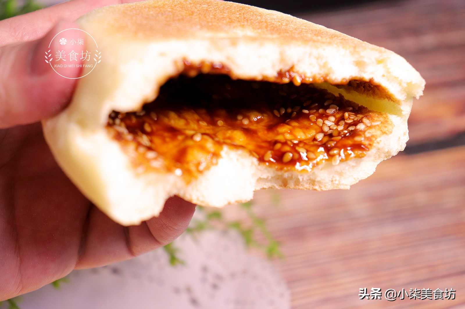 饼的中间夹着诱人的红糖馅,淡淡的芝麻香气,掰开香气扑鼻。红糖馅也不会滴答,咬一口甜中带香,喜欢吃的亲们一定要试试看,做给家人一起尝尝吧~