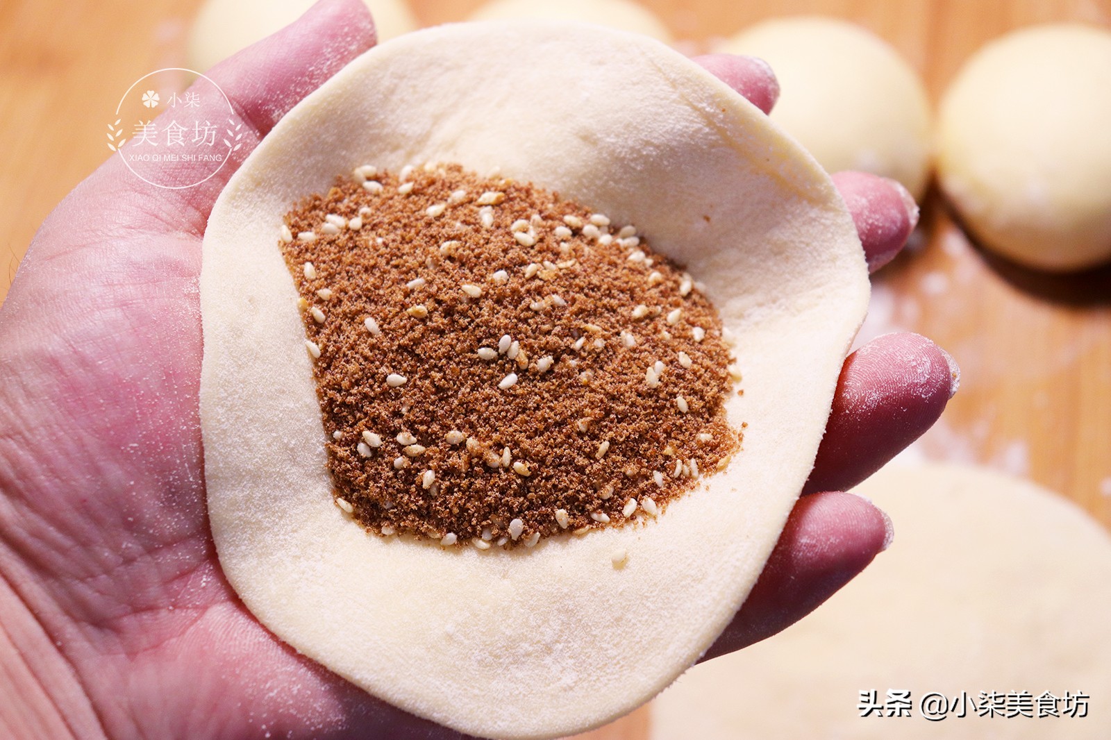 第八步:把擀好的饼皮放手心里,放入适量的红糖馅,糖不要放得太多呦。