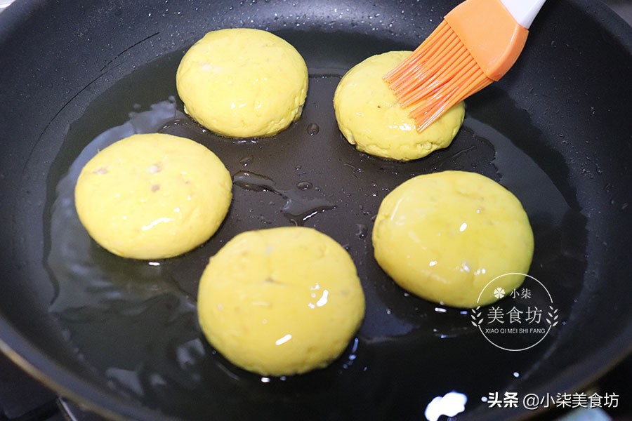 第七步:准备平底锅(电饼铛也可以),锅底部刷油,不要开火,先把南瓜饼轻轻放入锅中,把所有饼坯都做好后再打开火,把饼上面也刷上油,一定小火慢慢煎至。