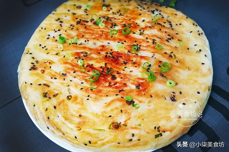 第六步:擀好的面片上抹上食用油,撒上适量的盐,喜欢吃五香粉的可以撒一点,再把葱圈撒在上面,再撒少许黑芝麻点缀。