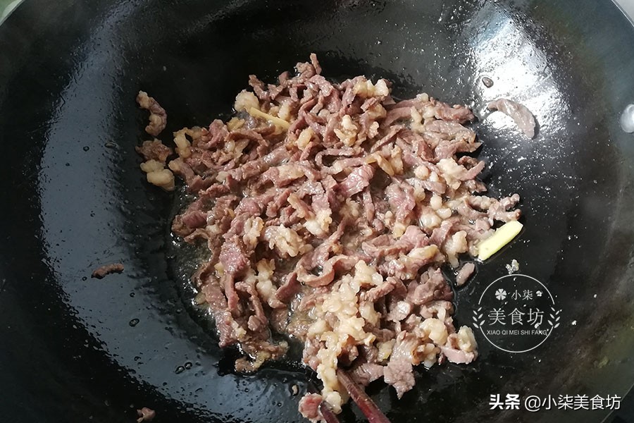 第六步:锅里倒入油,烧至5成热,放入腌好的牛肉条,快速搅拌,使颜色变白立即出锅,切记牛肉快炒不宜时间过长,炒老就嚼不动了,大约40秒左右。