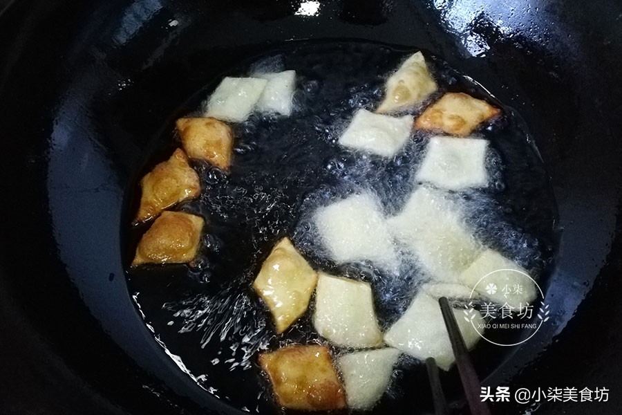 第八步:锅里倒入油,油温烧至5成热,用筷子头试下有小泡,把面片下进锅里,小火慢炸,面片飘起来翻面。