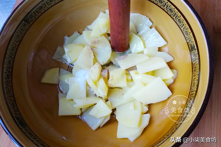 第三步:把蒸熟的土豆片放入碗里,加入盐、胡椒粉,再倒入20克食用油,用擀面杖挤压成土豆泥。