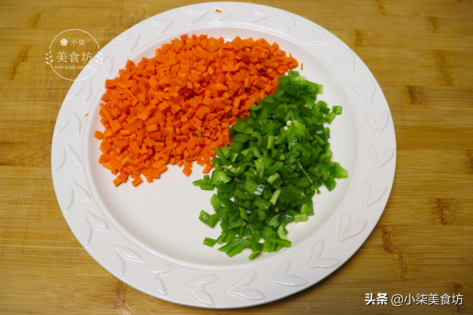 第三步:胡萝卜洗净去皮,切成小丁,青椒去蒂去籽,切成小粒备用。