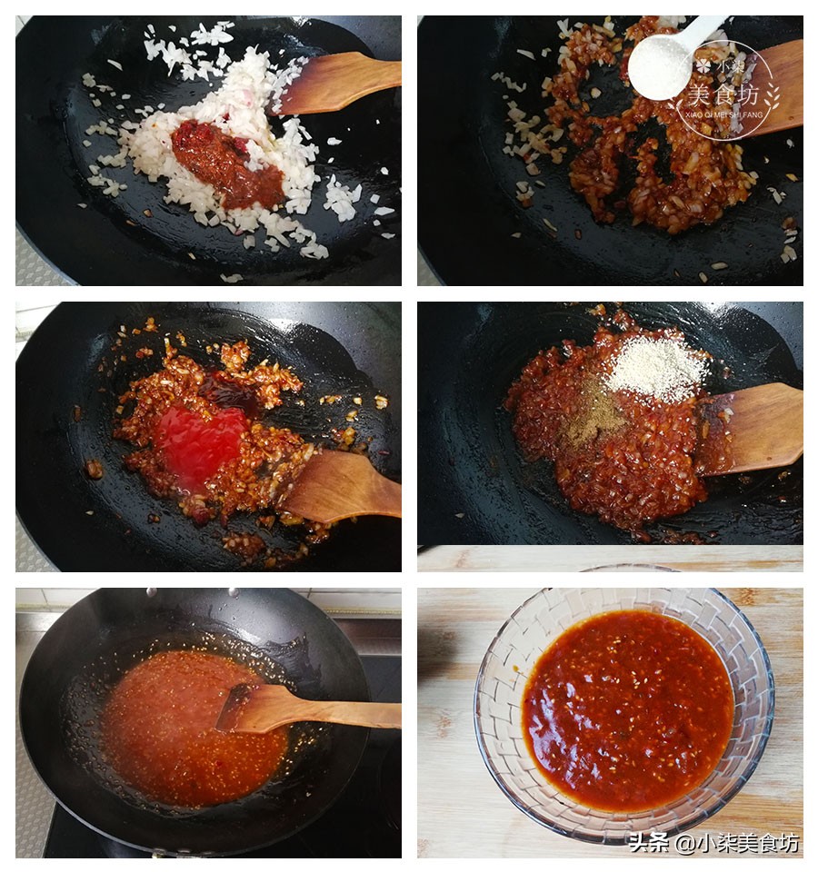 第五步:放入豆瓣酱炒出红油,不喜欢吃辣的也可以不放辣,加入白糖炒匀,放入番茄酱颜色变红,加入十三香、孜然粉增加独特的味道。