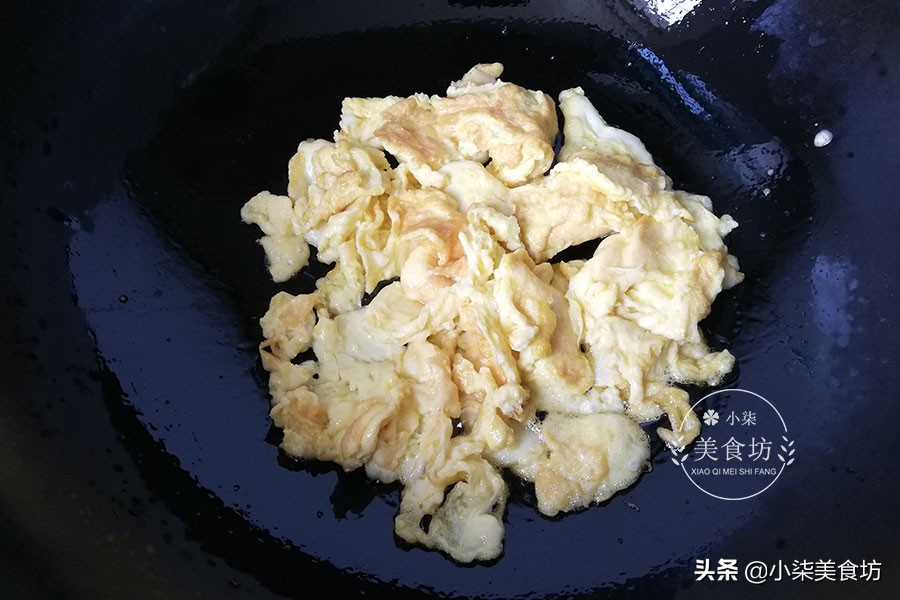 第六步:锅里倒入少许油,油热倒入鸡蛋液,把鸡蛋炒成大片,盛出备用。