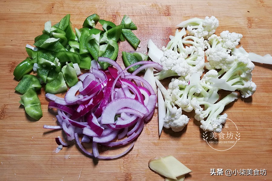 6、准备配菜,菜花洗净掰成小朵,洋葱切丝,青椒切块。