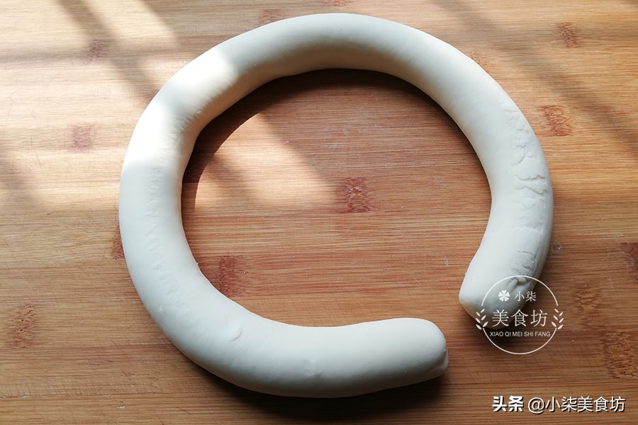 9、把饧好的面团取出放面板上,搓成长条。