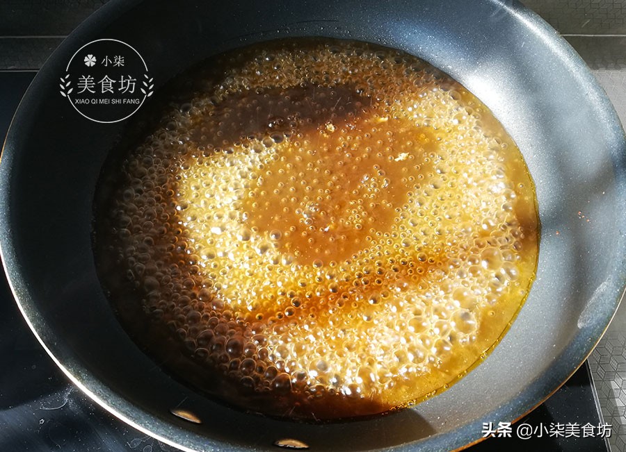 12、再倒少许水淀粉熬至起大泡,林如少量熟油,起到透亮的作用。