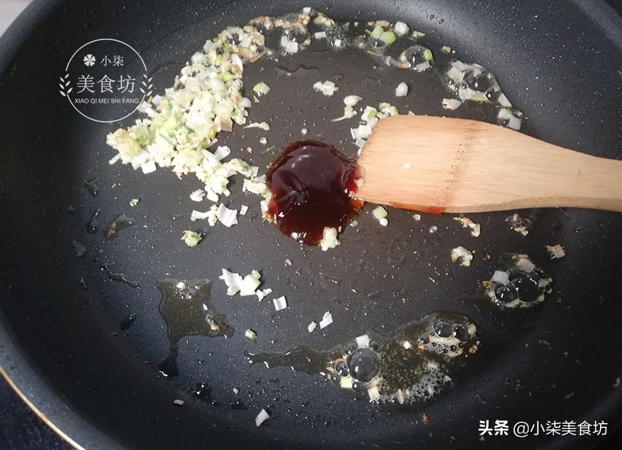 11、将小锅里倒少许油,小火烧热,放入葱、姜、蒜炒出香味,倒入蚝油,翻炒几下。