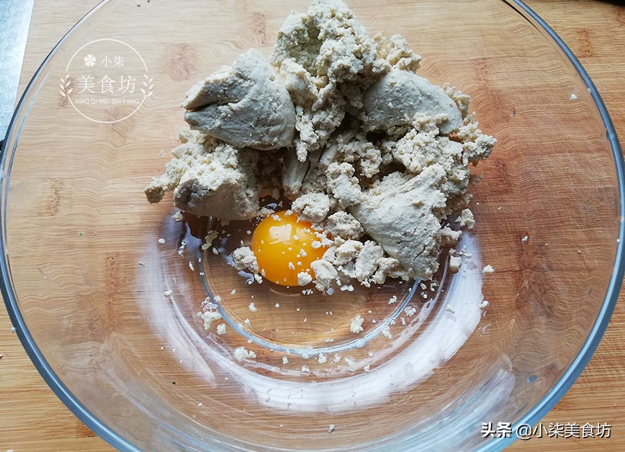 3、鸡蛋打入碗里,放入挤去水的豆腐,用手抓匀。