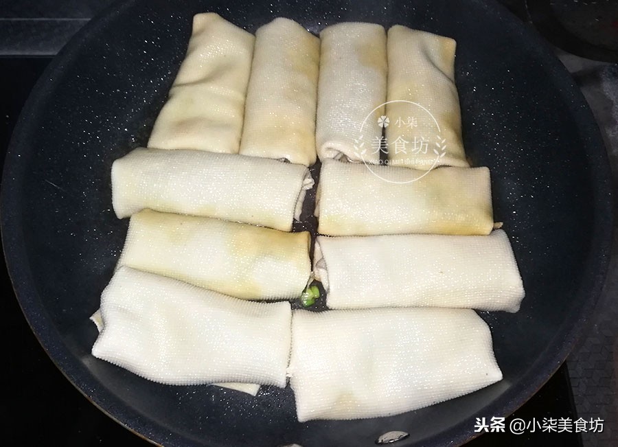 第十步:平底锅抹少许油,小火加热,放入卷好的豆腐皮锅贴。