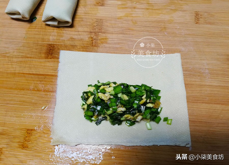 第七步:把烫好的豆腐皮切成方块,然后把韭菜鸡蛋馅放豆腐皮上面,如下图。