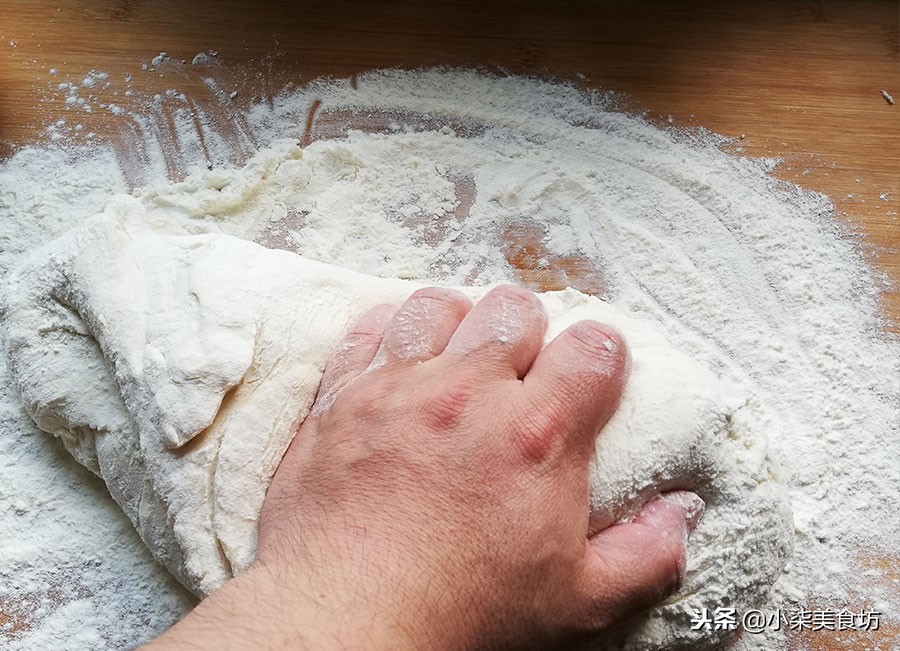 第七步、将揉好的面团,用掌心压成面饼,撒上适量的面粉,折叠压扁,做7~8次重复折叠,这一步很关键,决定馒头层次多少。