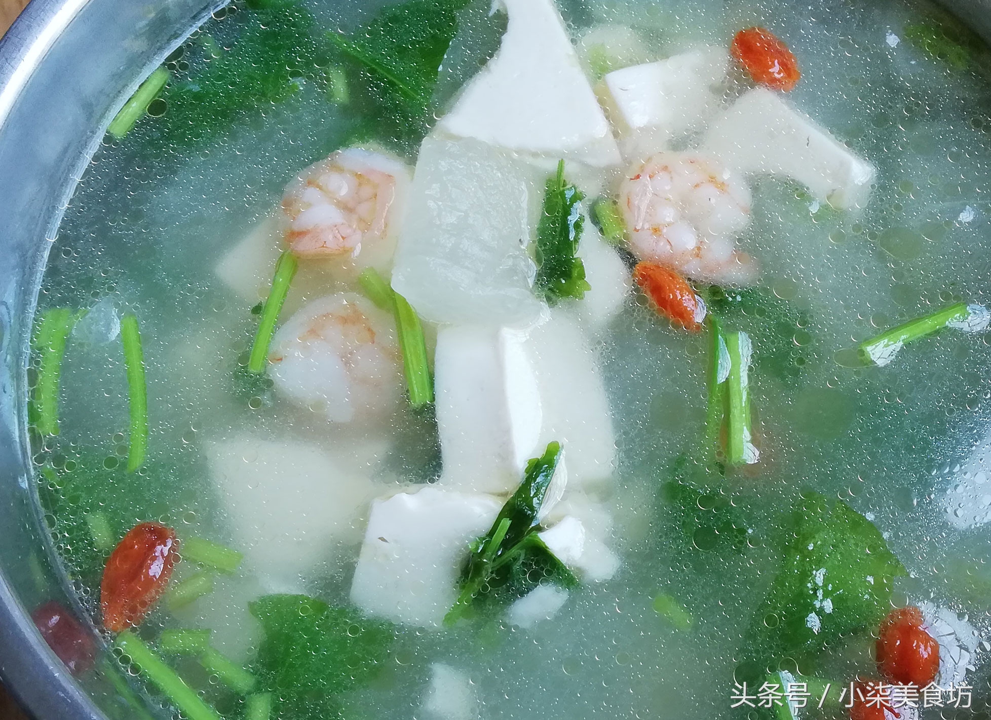 食材:冬瓜500克,虾仁6~7个,内脂豆腐100克,盐适量,香菜2根,香油少许