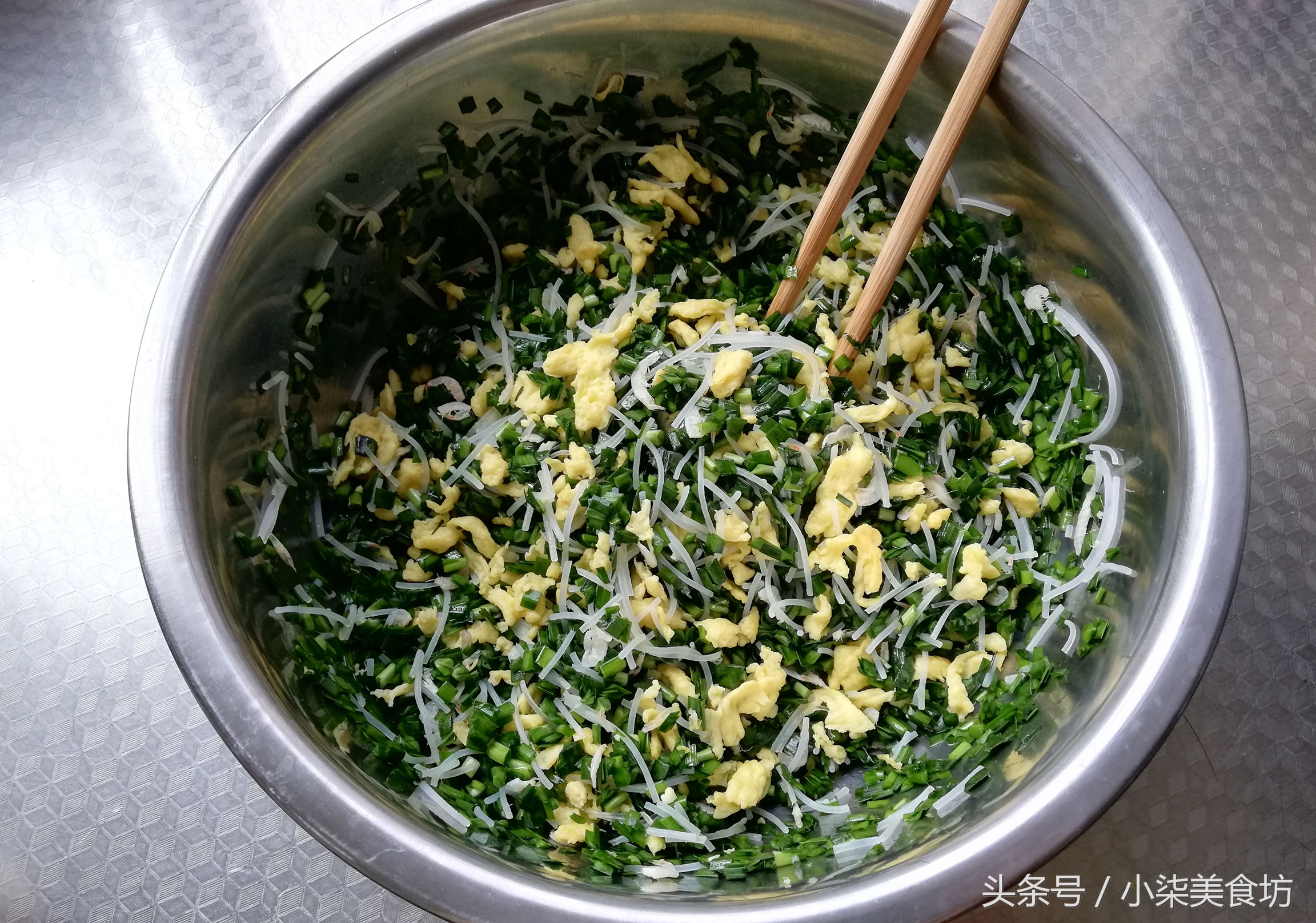 食材:面粉300克,开水200克,韭菜1把,鸡蛋2个,粉丝一小把,虾皮适量,菜籽油适量,蚝油2勺,盐适量,香油适量