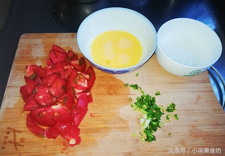 2、西红柿切小块,鸡蛋打碗里,打成蛋液,葱切成细葱花。