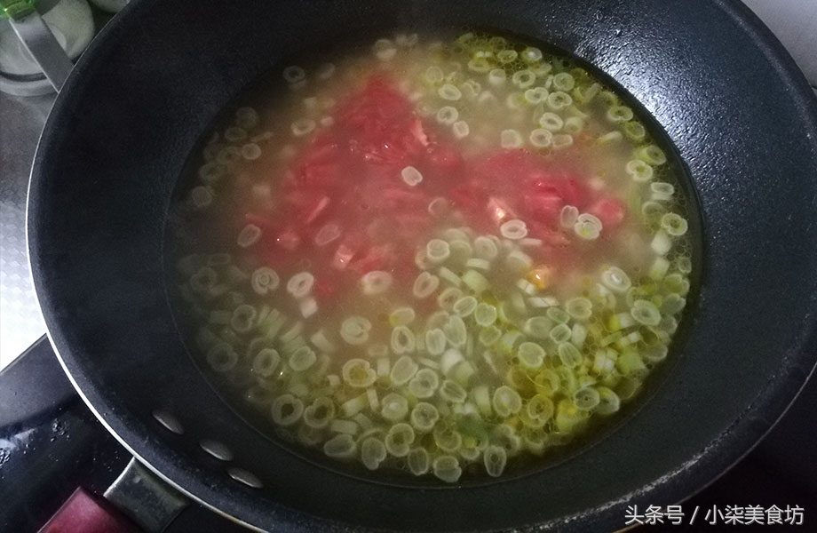 7、西红柿下进去,再煮4~5分钟,汤汁变红,加入盐、鸡精调味,放入香油搅匀,再放入葱花点缀,关火即可。