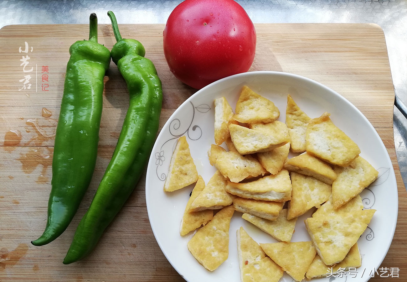 豆腐切成5~6毫米的片,再切三角形的片,放入油锅里煎成两面金黄,放盘子里,青椒、西红柿洗净