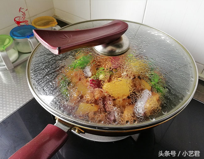 8.下入香菇,加热水适量,盖锅盖中火炖20分钟;