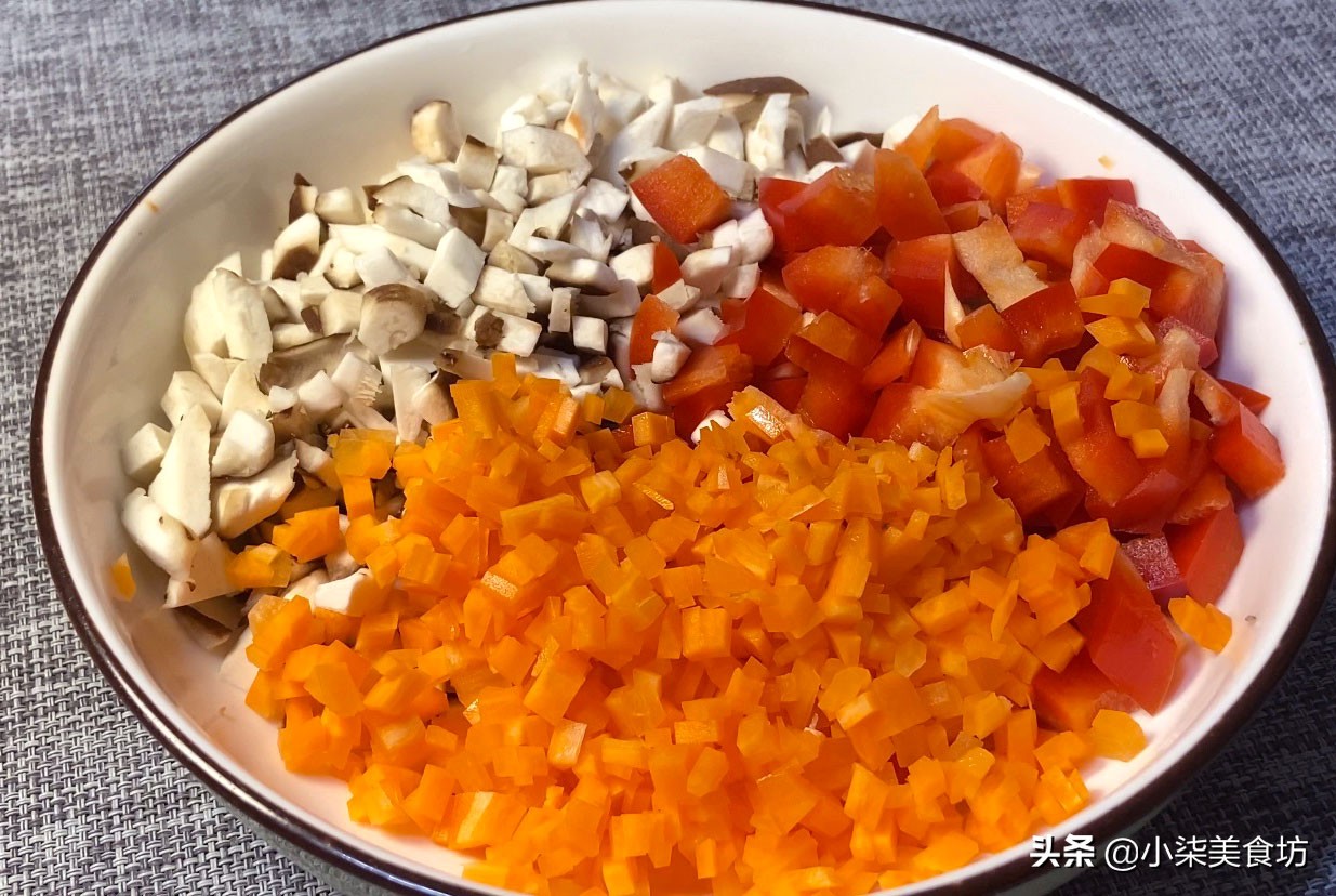 10、再把香菇丁,胡萝卜丁,红椒丁加进来,炒一分钟。