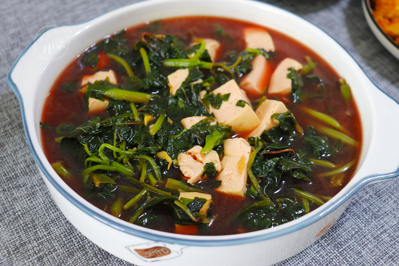 最后一道汤颜色红润,味道鲜美,选用嫩豆腐和新鲜的苋菜,放在锅里煲汤喝,营养又健康,苋菜含有丰富的维生素、钙、铁、锌多种微量元素,豆腐蛋白质含量高,和苋菜搭配好吃营养高。