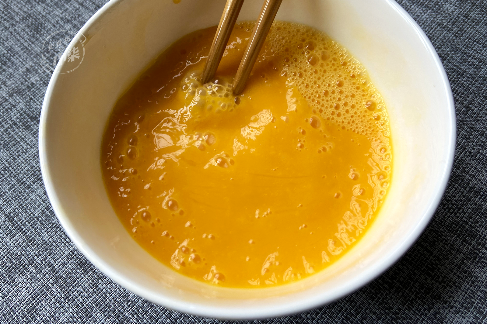 7、蛋液和水的比例为1:1.5倍,水的温度35度就可以,然后向水中加一点食盐搅拌化开,盐可以快速凝固蛋液,再把水倒进蛋液里。