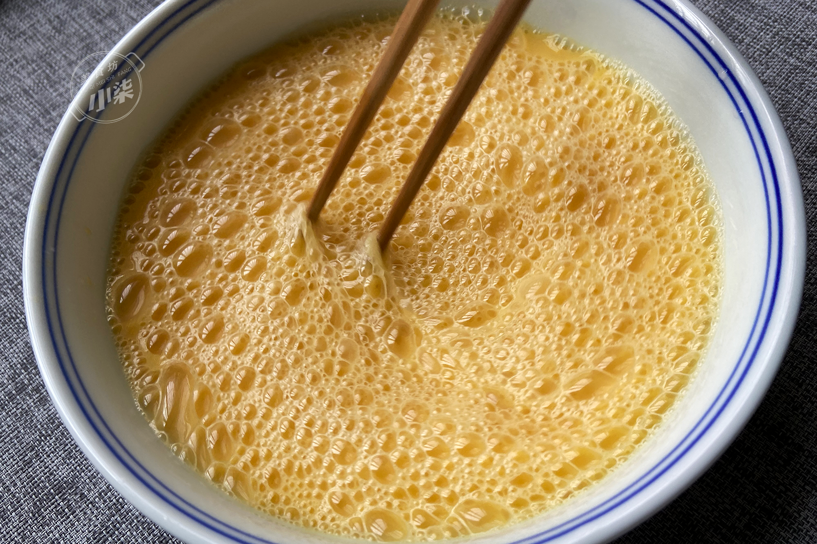8、然后再用筷子把鸡蛋液里面的空气给它全部赶出去,搅拌出大量的气泡。