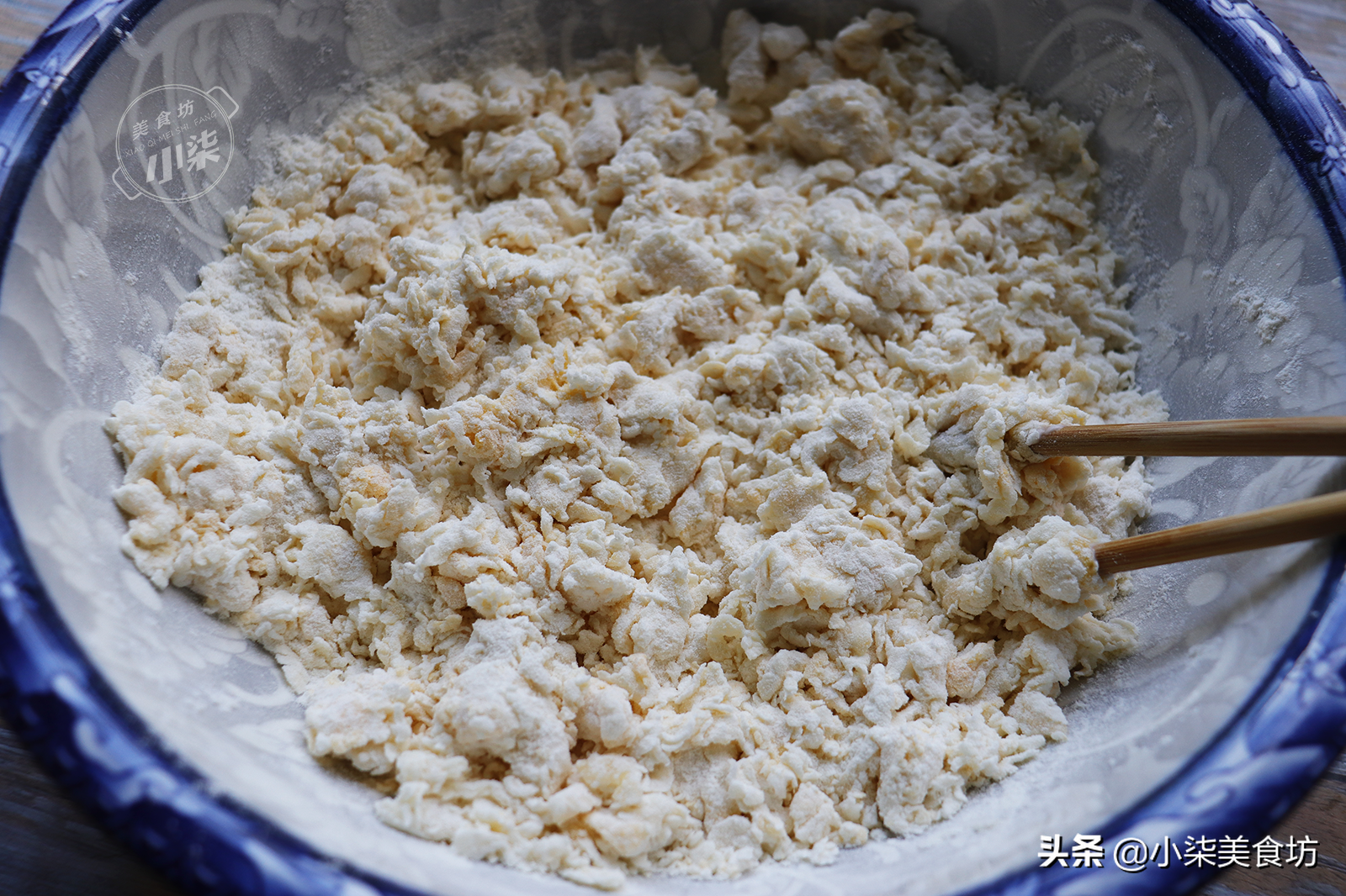 2、再加入120毫升纯牛奶和面,边倒边搅拌,搅拌成像这样的大面絮状就可以,如果鸡蛋是从冰箱里取出来的直接用,可以把牛奶稍微加热一会,温度不要烫手即可。