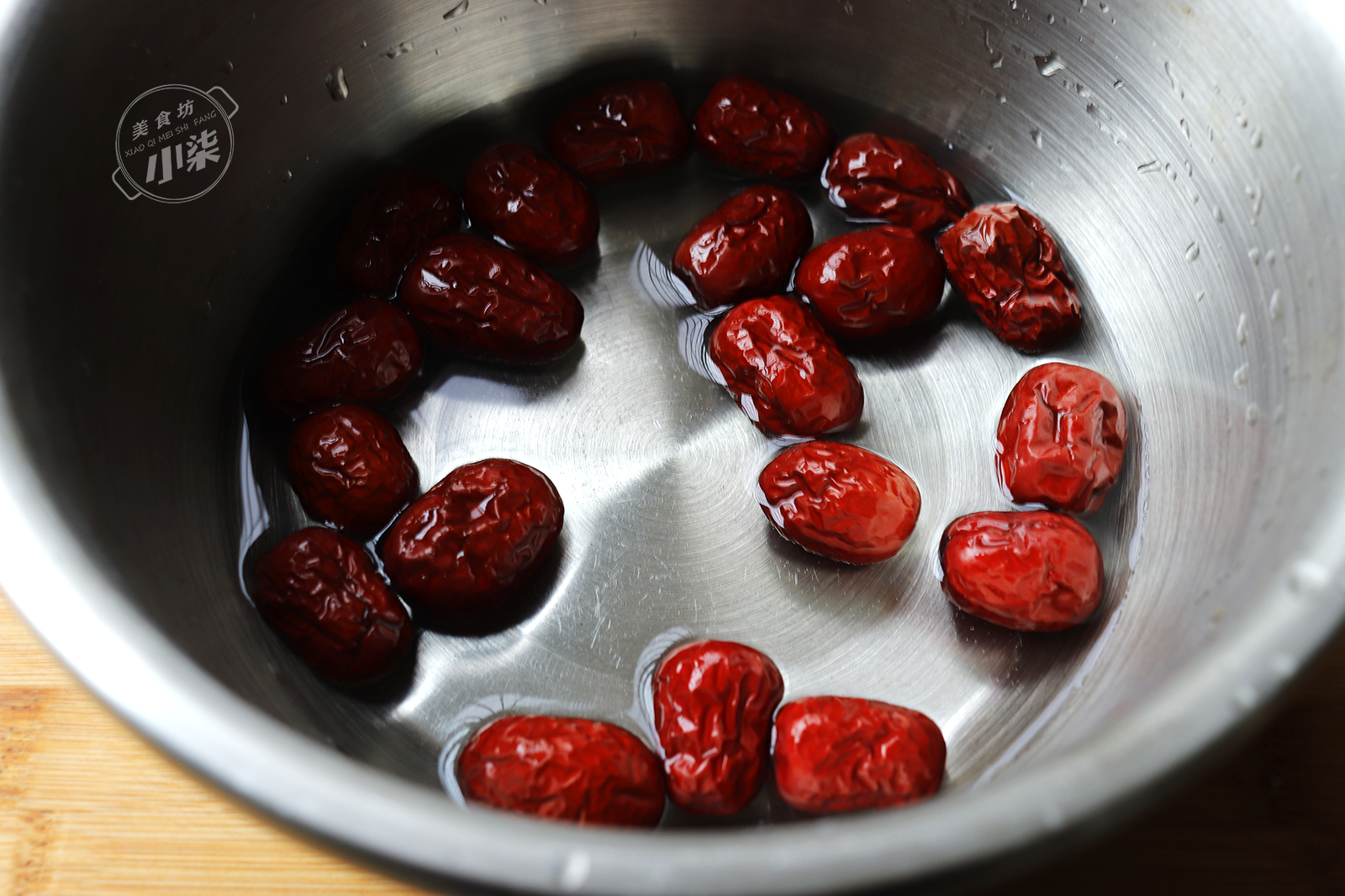 9、趁这个时间我们准备一把红枣放进盆里面,加入清水把它清洗一下,洗干净后把它捞出控水。