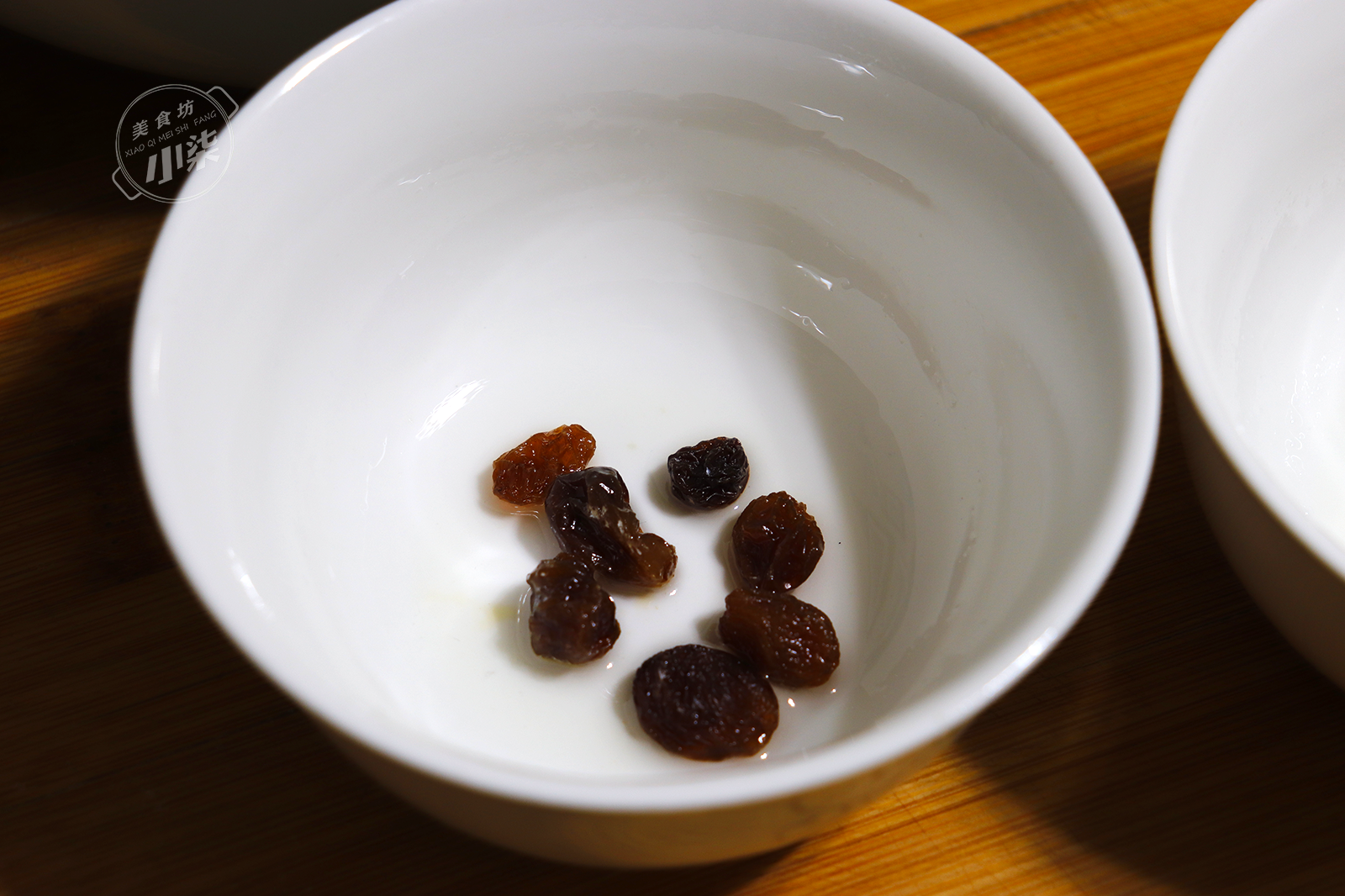 15、下面我们准备三个小碗,在碗里面刷上一层油,不需要太多,薄薄的一层就可以了,然后把洗净的葡萄干放进碗里面,每个碗里放几粒就可以。