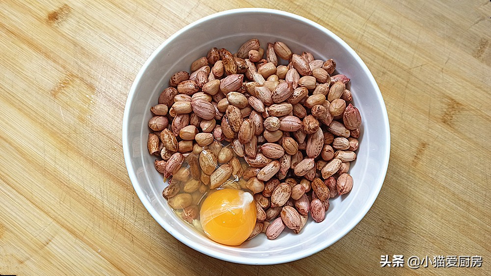 【步骤三】:把沥干水分的花生米倒入大碗中,打入一个鸡蛋和一勺盐,然后搅拌均匀,让花生米都裹上蛋液。