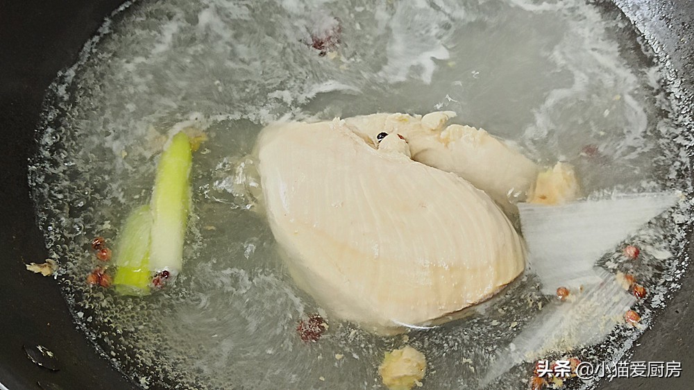 【步骤一】:把鸡胸肉去除油脂和筋膜,然后冷水下锅,水要没过鸡胸肉,放入生姜、大葱、料酒、大料、花椒,然后大火烧开,煮15分钟左右,把鸡胸肉煮熟。