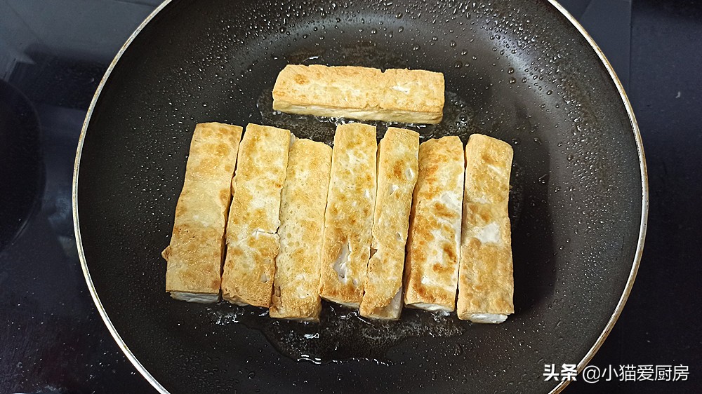 (4)煎的过程用小火,小火可以减少油量的吸收。豆腐没有定型不要乱动,容易把豆腐弄碎。