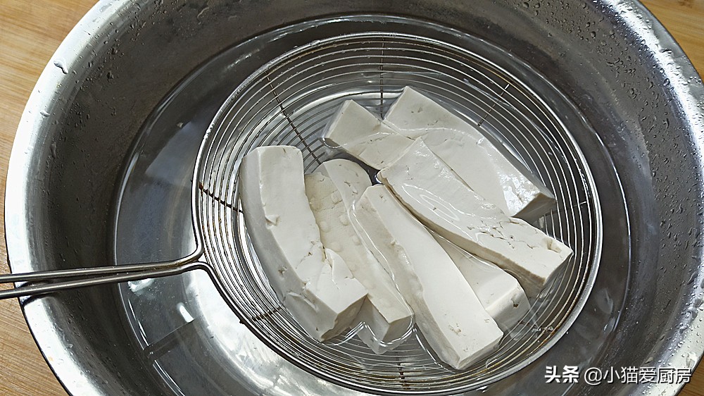 【步骤一】:把准备好的豆腐切成2厘米宽左右的长条,然后放开水锅中烫1分钟,用以去除豆腥味。
