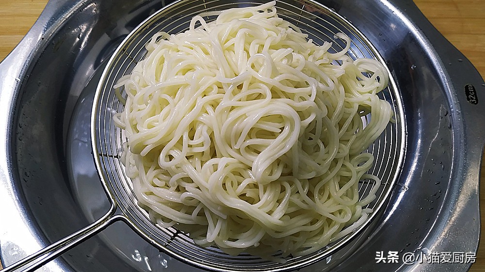 【步骤四】:面条煮至8分熟后,然后捞出来放入凉水中泡凉。