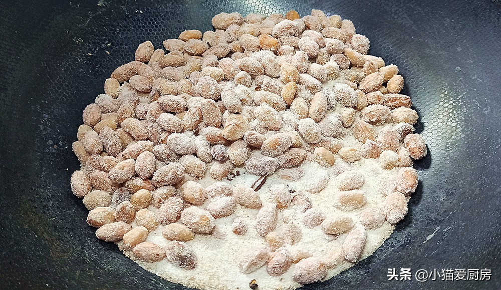 【步骤五】:然后倒入腌好的花生米,开小火进行翻炒,因为花生米表面有水分,所以这时候炒锅里面的精盐,会紧紧地包裹住花生米。这属于一种正常现象。